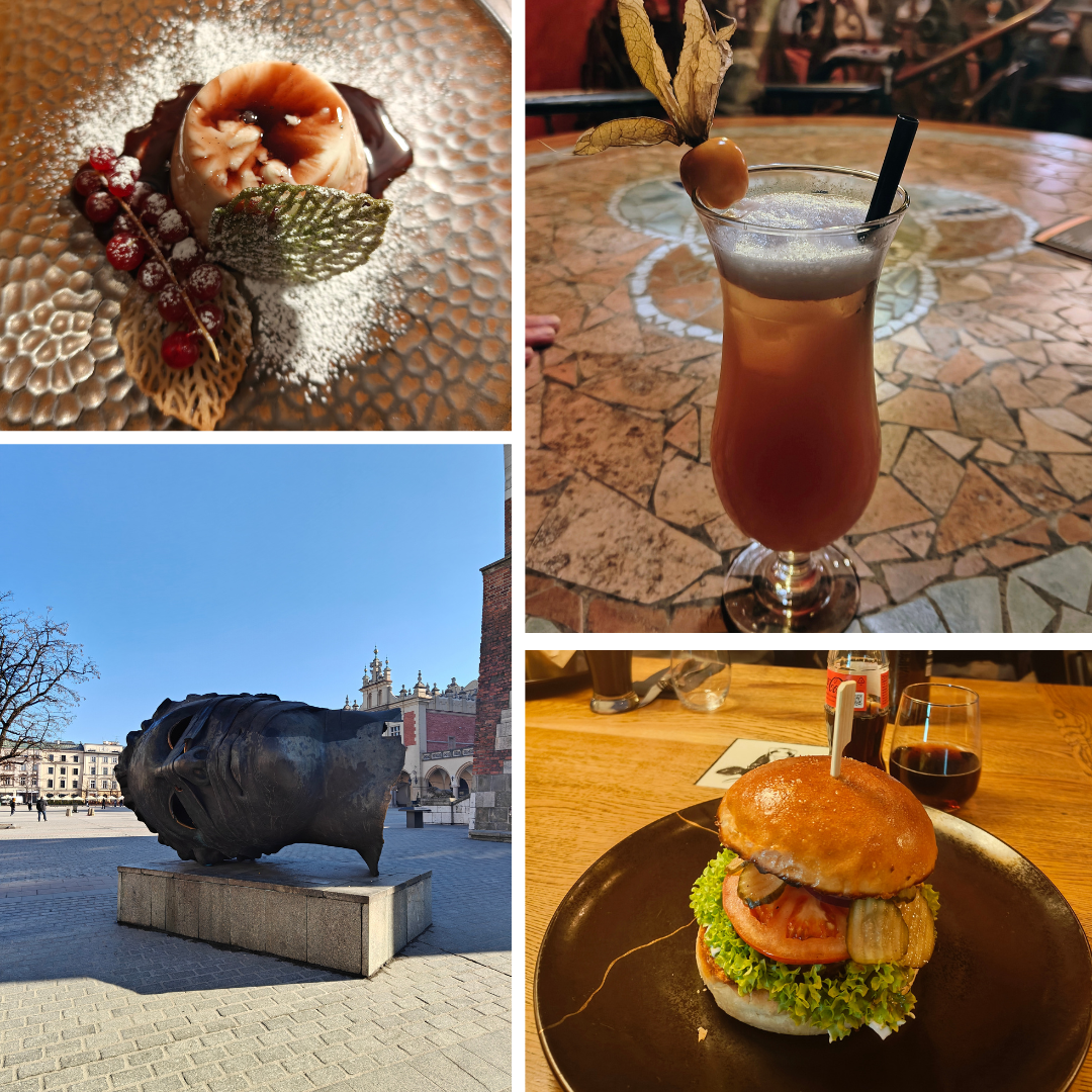 Ensimmäisenä iltana söimme hyvää italialaista ruokaa Sorrento-nimisessä ravintolassa, ja ensimmäisen konferenssipäivän jälkeen löysimme vanhasta kaupungista hieman piilossa olevan buddha-teemaisen paikan, jossa pääsimme maistamaan teeman mukaisia drinkkejä. Pitkän konferenssipäivän jälkeen oli virkistävää nauttia paikan tunnelmasta ja purkaa konferenssin aikana heränneitä ajatuksia. Drinkkien jälkeen päädyimme vielä lähellä olleeseen Moo Moo -ravintolaan syömään täyttävät juustohampurilaiset. Paikkaa ei voi suositella kasvissyöjille eikä esteetikoille (ravintolaa koristivat lihavitriinit, apua…) mutta perinteisen burgerin ystäville se tarjoaa varsin meheviä annoksia. Ruoka oli sekä maukasta että edullista, ja Krakova sopiikin sen takia mainiosti myös ruokaseikkailukaupungiksi.