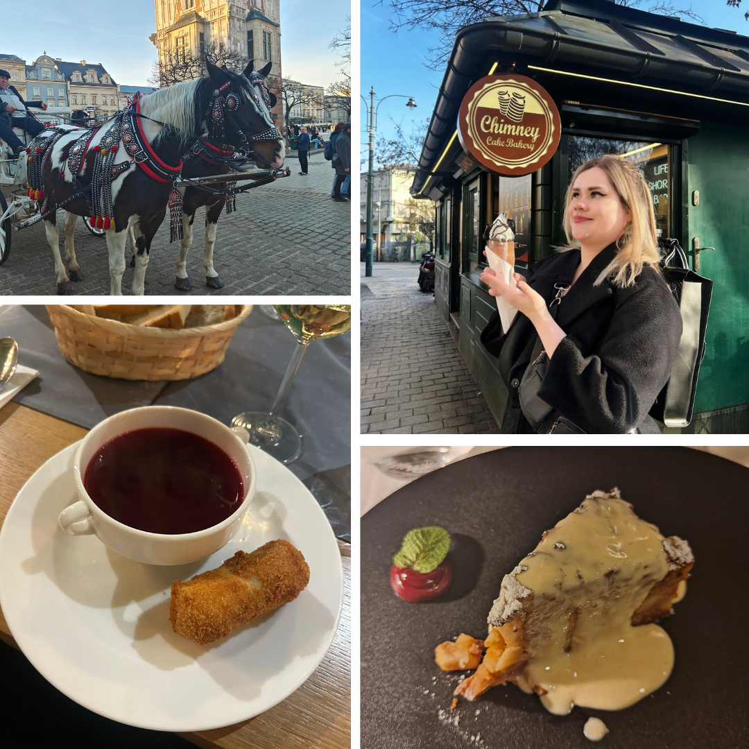 Tällä kertaa emme itse valinneet ravintolaa, vaan osallistuimme konferenssi-illalliselle tyylikkäässä Pod Gruszką -ravintolassa, jossa pääsimme maistamaan muun muassa borssikeittoa upeissa puitteissa ja tietenkin myös keskustelemaan muiden konferenssiin osallistuneiden kanssa. Pohdimme muun muassa suomen ja unkarin kielen eroja ja yhtäläisyyksiä. Illallisen jälkeen kaipasimme vielä jälkiruokaa, ja kävimme syömässä lähellä olleessa Michelin-ravintolassa (Kogel Mogel) palat omenapiirasta. Jenny otti myös mielenkiintoisen mocktailin, joka yhdisti basilikan ja greipin maut. Se oli yllättävän hyvää! Vanhassa kaupungissa näkyi matkallamme useita hevoskärryjä, jotka olivat selvästi osa kaupungin viikonlopun tarjontaa. Ajelut jätimme omalta osaltamme tällä kertaa väliin.