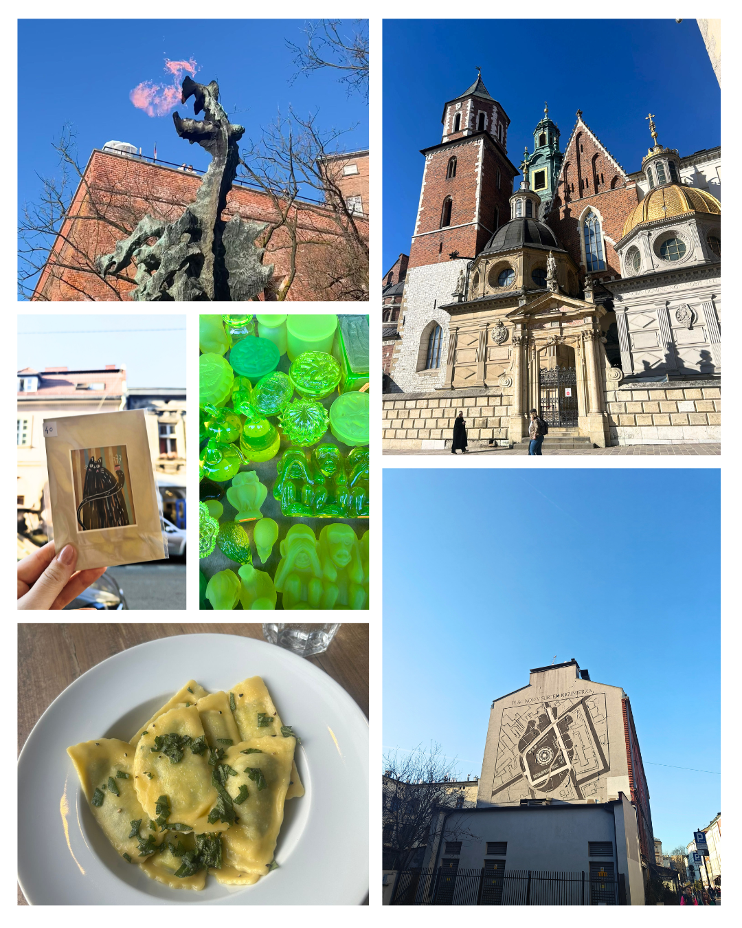 Viimeiselle päivälle säästimme kaksi suosittua kohdetta: Wywelin mäen ja Kazimierzin korttelin. Wywelin linnaa ehdimme ihastelemaan vain ulkoapäin, mutta kompaktimpaan katedraaliin ostimme pääsyliput. Katedraali oli varsin koristeellinen, ja kellotornista avautui näkymä Krakovan kaupungin ylle. Tietenkin kävelimme myös kuuluisalle lohikäärmepatsaalle ja odotimme, kunnes näimme sen sylkevän tulenlieskoja suustaan. Päivä oli aurinkoinen; krookukset kukkivat mäellä ja taivaalla leijaili kuumailmapallokin. Lohikäärme olisi todennäköisesti vaikuttavampi hämärämmissä olosuhteissa, mutta kevätsäässä kävelyä ei kyllä voita mikään.