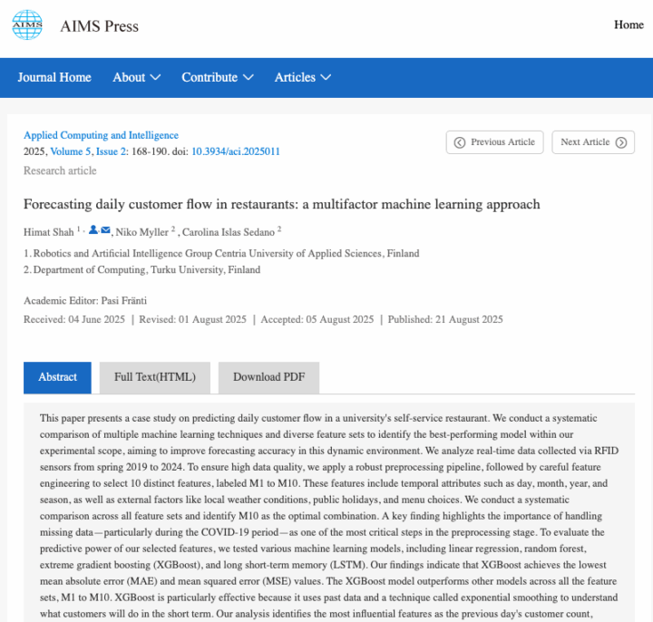 First journal article produced by the project was written by Shah, Myller, and Islas Sedano (2025) exploring how to accurately forecast daily customer flow in a Flavoria restaurant using machine learning. By combining sensor data with external factors like weather, holidays, and menu details, the researchers found that the XGBoost model delivered the most accurate predictions. Their findings highlight how data-driven forecasting can support smarter planning and sustainability in food service operations.