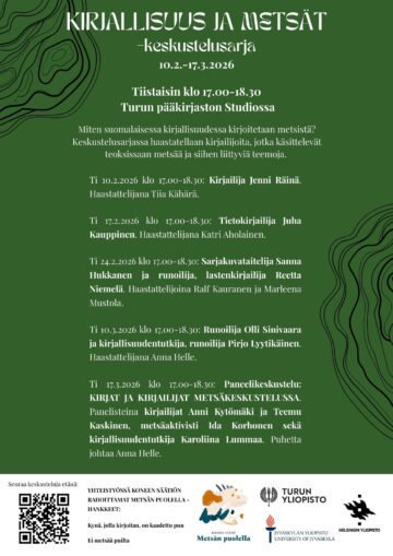 Miten suomalaisessa kirjallisuudessa kirjoitetaan metsistä? Mikä on kirjallisuuden rooli metsiä koskevassa julkisessa keskustelussa? Näitä kysymyksiä pohditaan Kirjallisuus ja metsät -keskustelusarjassa Turun pääkirjastossa helmi-maaliskuussa 2026. Sarjassa haastatellaan kirjailijoita, jotka käsittelevät teoksissaan metsää ja siihen liittyviä teemoja.