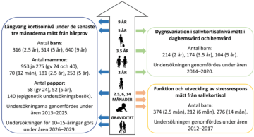 • Effekten av mammans psykiska välbefinnande under graviditeten på barnets kortvariga kortisolstressrespons i åldern 2,5, 6 och 14 månader.