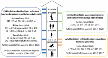 Verinäytteestä tutkimme erityisesti aineenvaihduntaan, tulehdukseen ja stressinsäätelyyn liittyviä laboratorioarvoja. Hiusnäytteestä mitataan pitkäaikaista stressihormonipitoisuutta (kortisoli, kortisoni). Siemennestenäytteestä pyritään selvittämään miten aikaisempien sukupolvien elintavat ja elämänkokemukset ovat yhteydessä jälkikasvun terveyteen. Siittiöistä eristetään sekvennoimalla mikroRNA-molekyylit. Eläintutkimuksissa (pääosin hiiritutkimukset) on pystytty osoittamaan, että stressillä ja ympäristötekijöillä on vaikutusta erilaisten mikroRNA-molekyylien esiintyvyyteen sukusoluissa. Eläintutkimuksissa näiden mikroRNA-molekyylien on osoitettu osallistuvan jälkeläisen keskushermoston kehityksen epigeneettiseen säätelyyn. Tämän osatutkimuksen tarkoituksena on tutkia näiden mekanismien toimintaa ihmisillä ja miten ne voisivat vaikuttaa seuraavan sukupolven aivojen kehitykseen.