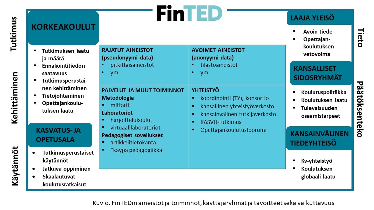 Opettajankoulutuksen kansallinen tietovaranto FinTED (Finnish Teacher Education Database) on käynnistysvaiheessa oleva aineistotutkimusinfrastruktuuri, jota voidaan hyödyntää tutkimuksessa sekä opetuksen ja koulutusten kehittämisessä kaikilla koulutusasteilla. Tietovarannon perustan muodostaa Kasvatusalan soveltuvuuskokeessa opiskelijaksi valittujen seurantatutkimuksessa (KASVU) kerättävät valtakunnalliset tutkimusaineistot. FinTED perustuu avoimen tieteen periaatteisiin, ja tietovarantoon kerättävät aineistot ovat korkeakouluille avoimesti käytettävissä. Työ tietovarannon parissa on käynnistynyt vuonna 2020.