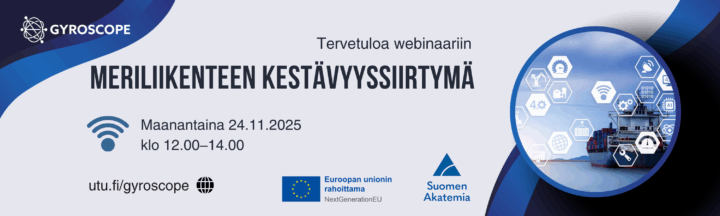 Gyroscope-hankkeessa tutkimme merialan vihreää siirtymää tukevien älykkäiden digitaalisten ratkaisujen tarjoamia mahdollisuuksia ja niihin liittyviä riskejä. Hanketta koordinoi Turun yliopiston Tulevaisuuden tutkimuskeskus ja mukana partnereina ovat Merikotka – Meriturvallisuuden ja -liikenteen tutkimusyhdistys, Aalto-yliopisto sekä Helsingin yliopisto.