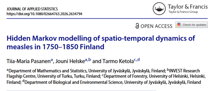 Pasanen, T. M., Helske, J., & Ketola, T. (2026). Hidden Markov modelling of spatio-temporal dynamics of measles in 1750–1850 Finland. Journal of Applied Statistics, 1–25. https://doi.org/10.1080/02664763.2026.2634794