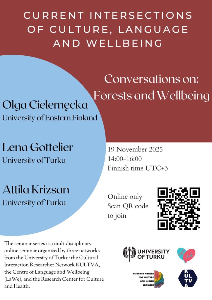 The seminar series is a multidisciplinary online seminar organized by three networks from the University of Turku: the Cultural Interaction Researcher Network KULTVA, the Centre for the Study of Language and Wellbeing (LaWe), and the Research Center for Culture and Healthhttps://sites.utu.fi/kulttuurin-ja-terveyden-tutkimusyksikko/en/.