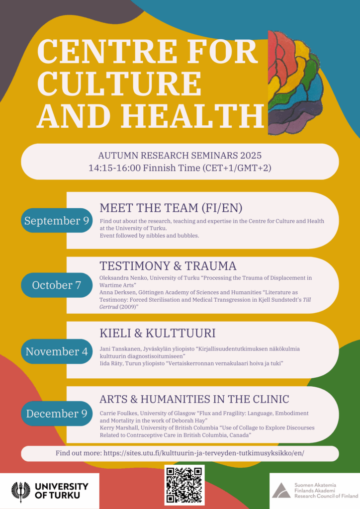 The Centre for Culture and Health at the University of Turku will also be organising a research seminar programme for Spring-Summer 2026. If you are interested in presenting your research in the future, please get in touch with Avril Tynan (aatyna@utu.fi) and Ranjana Saha (ranjana.saha@utu.fi).