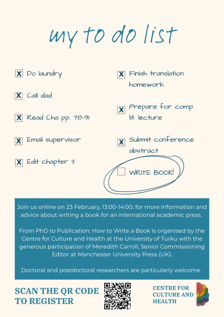 23.2.2026 Kirjan kirjoittaminen: väitöskirjasta kirjaksi. 13:00-14:00 (Zoomissa)