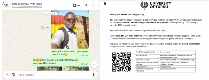 At the start of 2025, I was in Turku, Finland, preparing for my first PhD data collection fieldwork in Malawi. My plan was to conduct a survey, physically meeting residents of Lilongwe from both planned and unplanned areas, to understand how they value urban nature — whether positively or negatively — through their daily activities. On paper, everything was in place, and I had done all the necessary preparations. Yet I was still afraid— and I kept asking myself: “What exactly am I afraid of?”