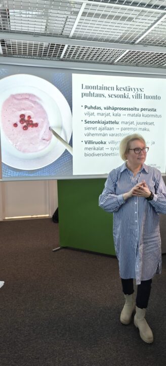 Seuraavaksi projektiasiantuntija Nanna Rintala (Turun yliopisto) esitteli, miten suomalainen ruokakulttuuri, erityisesti Varsinais‑Suomen perinteet, tarjoavat poikkeuksellisen vahvan pohjan kestävälle ruokajärjestelmälle. Puhtaat ja vähän prosessoidut raaka‑aineet, sesonkiajattelu sekä villiruoan hyödyntäminen tekevät suomalaisesta gastronomiasta luonnostaan ympäristöystävällistä.