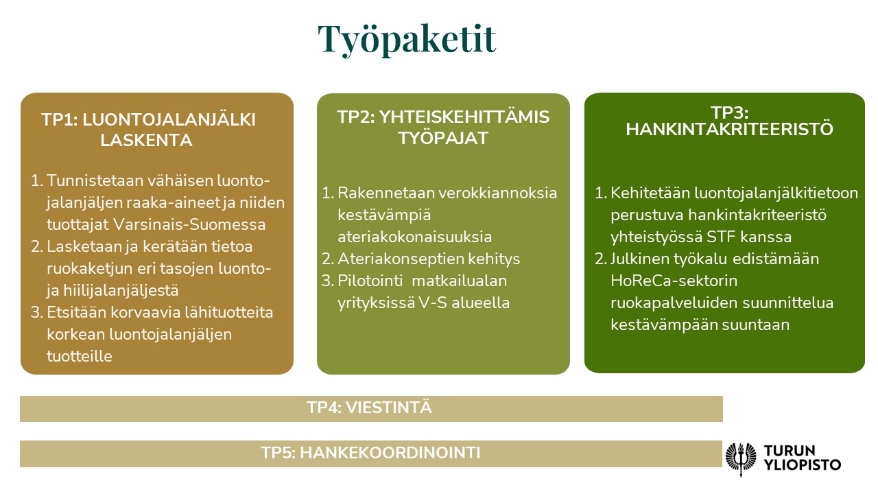 Hanke koostuu viidestä työpaketista. Ensimmäisessä tavoittena on tunnistaa luontojalanjälkilaskennan avulla paikallisia, luonnon monimuotoisuutta tukevia raaka-aineita. Näiden pohjalta rakennetaan ravitsemuksellisesti tasapainoisia ateriakonsepteja, jotka ovat helposti otettavissa käyttöön HoReCa sektorilla.