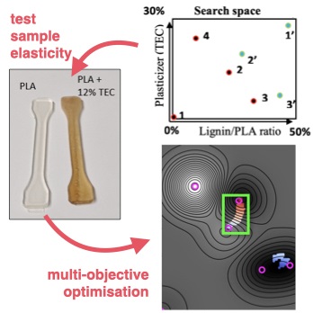 To convert wood lignin from pulp industry waste to new products, we are compounding it with PLA polymers and TCA plasticisers to achieve plasticity. AI tools help to guide experimentation and discover which blend formulations simultaneously optimise multiple elastic properties.