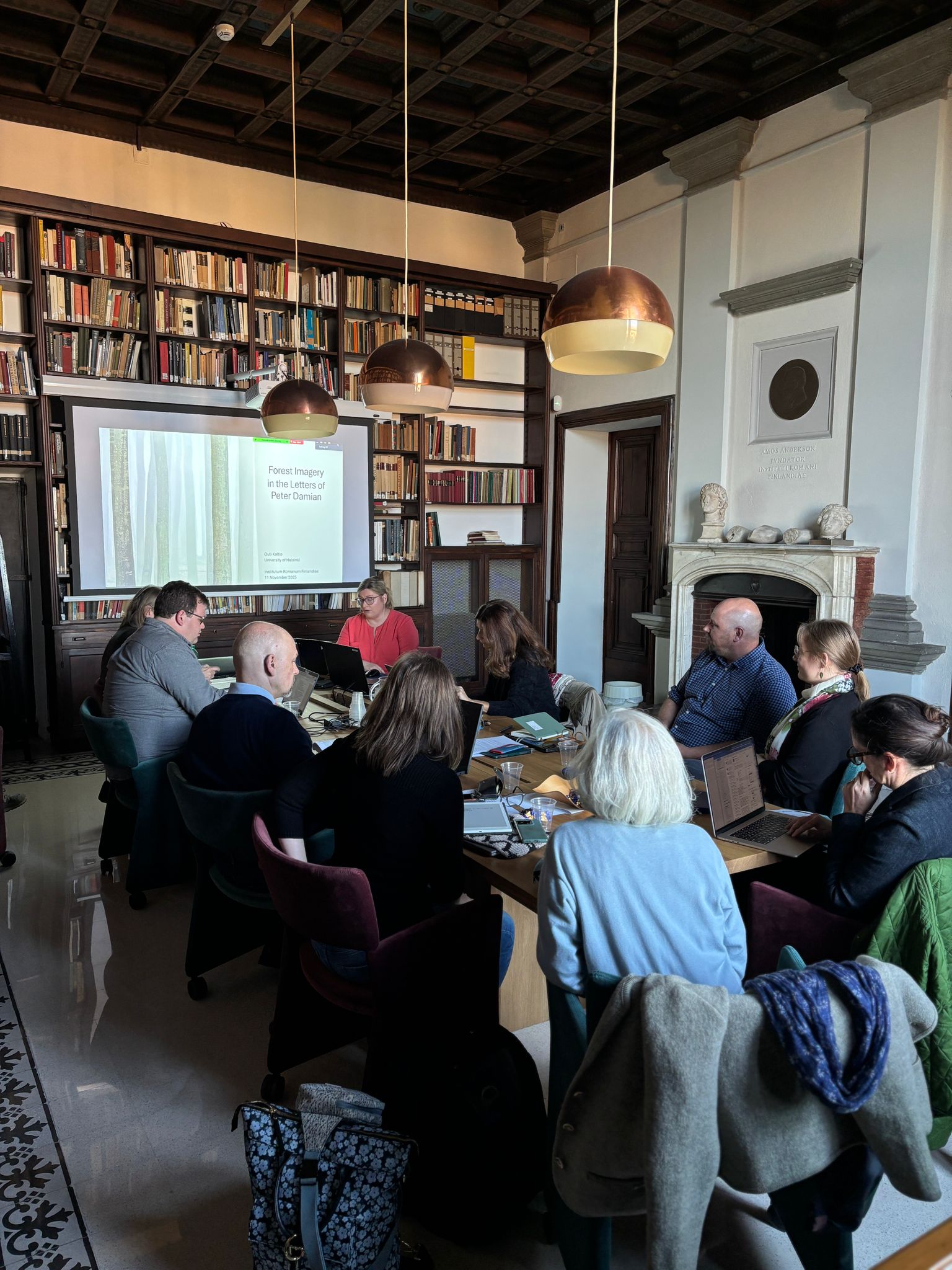 Heti seuraavana päivänä koitti yksi matkan keskeisistä etapeista, kun pidimme Suomen Rooman-instituutissa seminaarin yhdessä Italiassa toimivien yhteistyötahojemme kanssa. Seminaarin puhujina olivat projektimme jäsenten lisäksi Valeria Beolchini (Escuela Española de Historia y Arqueología en Roma), Chiara Paniccia (Ministero della Cultura), Caroline Goodson (American Academy in Rome), sekä Suomen Rooman-instituutin johtaja Ria Berg. Seminaarin aihe, Concepts and Uses on Nature in Premodern Italy, innosti osallistujia tarkastelemaan ihmisen ja luonnon suhdetta monipuolisesti, antiikin käsityksistä aina sydänkeskiajan kulttuurisiin ilmiöihin. Eri tieteenalojen ja aikakausien näkökulmat resonoivat keskenään ja loivat kokonaisuuden, joka valaisi luonnon ja ympäristön kulttuurisia merkityksiä sekä jatkuvuuden että muutoksen kannalta läpi vuosisatojen