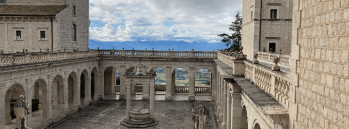 Paavi Gregorius I (n. 540–604) kertoo Benedictus Nursialaisen (n. 480–543) elämäkerrassa, että vuoren huipulla oli ennen luostaria Apollon temppeli ja sitä ympäröivä pyhä lehto. Benedictuksen kerrotaan hävittäneen temppelin ja kaataneen lehdon puut. Ajaessamme aamulla serpentiinitietä ylös oli helppo ymmärtää, miksi paikka on vuosisatojen ajan nähty sekä hengellisen vallan näyttämönä että maisemaa määrittävänä maamerkkinä – olimme kuin pilvien yläpuolella.