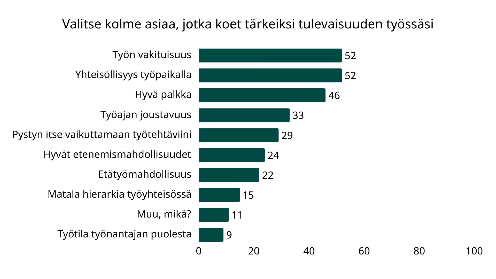 Epävakaassa taloustilanteessa opiskelijat painottavat työelämässä perusturvaa ja toimivaa arkea. Noin puolet vastaajista pitää tärkeänä hyvää palkkaa, työsuhteen jatkuvuutta ja hyvää työyhteisöä.