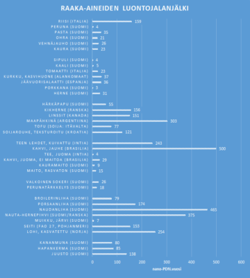 Luontojalanjälki on esitetty nano-PDN.year -yksikössä (miljardisosa PDN:stä). Huomioi, että öljyt ja rasvat esitetään erillisessä taulukossa.