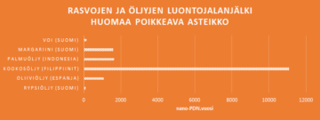 Rasvojen luontojalanjäljet ovat usein moninkertaisesti suurempia kuin muilla raaka-aineilla. Tässä kuvassa käytetään eri mittakaavaa kuin muissa vertailuissa, jotta öljyjen väliset erot ovat luettavissa. Yksikkö on nano-PDN.year (miljardisosa PDN:stä).