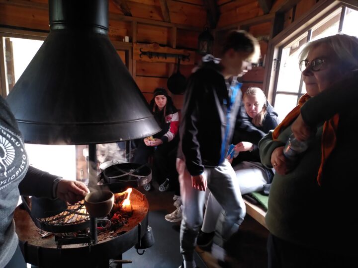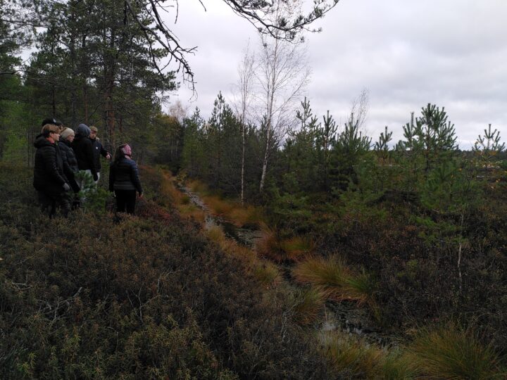 Iltapäivä vietettiin maastossa. Turvetuotantoalueen viereisen Metsälammen alueen varauskota toimi tukikohtanamme. Kenttätyöskentely aloitettiin kulkemalla Metsälammen kiertävää polkua pitkin kodalle. Kodalta suuntasimme metsän halki kohti turvetuotantoalueen reunaa. Alueelle suunnitellaan aurinkovoimahanketta, jonka myötä teollisessa käytössä oleva maa-ala laajenisi nyt talousmetsänä olevalle turvemaalle ja osin virkistysreitistön päälle. Kulkumme pysähtyi turvekenttää reunustavalle valtaojalle. Oja tarjosi hyvän havaintokohteen maaperän kerrostumiin ja soistumiseen, sillä ojaan on muodostunut rahkasammalta. Märässä maastossa suopursujen seassa kulkeminen havainnollisti omalta osaltaan turvemaan ominaisuuksia. Jokuset kengätkin siinä taisivat kastua. Kodalle palattuamme keskustelimme havainnoista ja pohdimme niiden merkitystä eri skenaarioiden toteutumisen kannalta. Viimeisenä tehtävänä opiskelijat jakautuivat kolmeen työryhmään, ja valitsivat työstettävät skenaariot. Työn alle otettiin turvetuotannon jatkuminen (business as usual, BAU), uusiutuvan energian tuotanto aurinkovoiman avulla ja biodiversiteetin maksimointi ennallistamalla alue.
