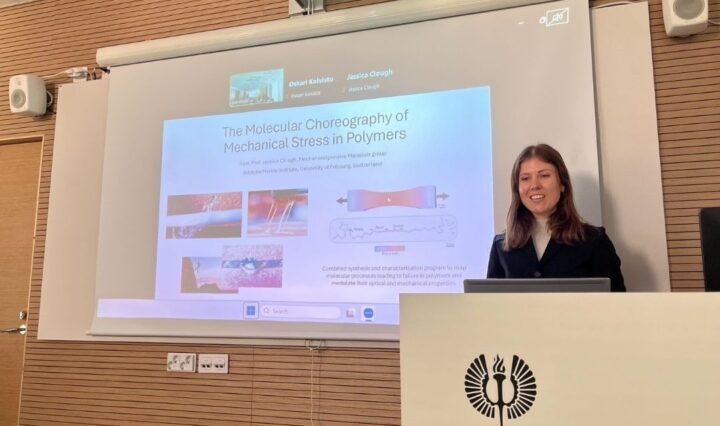 We were delighted to host Prof. Jessica M. Clough from the Adolphe Merkle Institute (AMI) in Switzerland for a research seminar entitled “The Molecular Choreography of Polymers under Mechanical Stress.” In her talk, Prof. Clough introduced advanced mechanophore-based approaches for visualising and quantifying mechanical stress and strain in solid-state polymeric materials at the molecular level.
