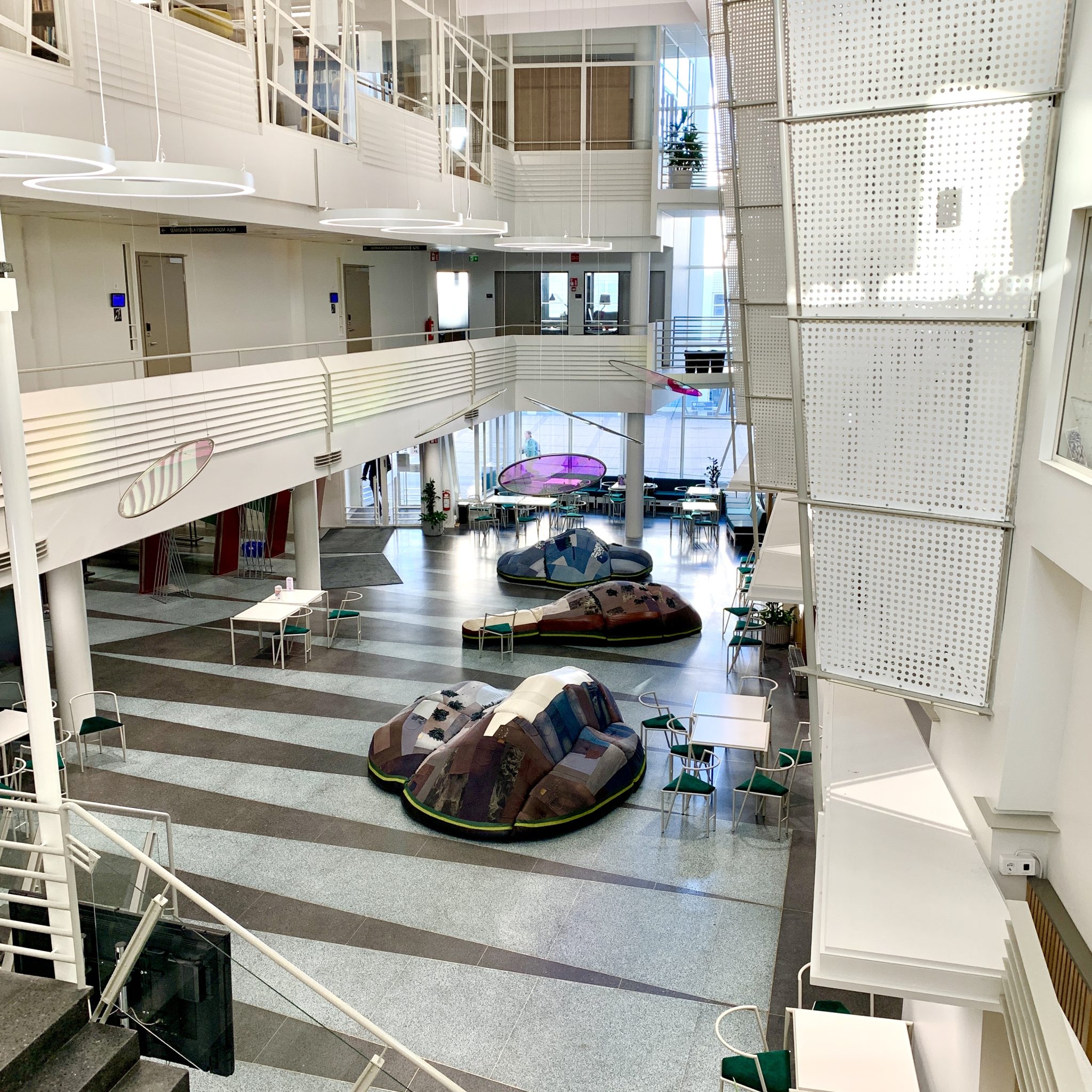 Pehmeiden saarekkeiden päältä todella avautuu aivan uusi maisema – jos ei maailmaan niin vähintään aulaan. Teoksen yläpuolella riippuvien värikkäiden levyjen taittama valo sekoittuu katon valkoisiin pintoihin kuin kynän kosketus värityskuvaan; ympärillä kieppuvat keskustelut kietoutuvat toisiinsa, sulautuen yhdeksi ääneksi, joka sanoo samalla kaiken ja ei mitään. Luodolla makaava kokija on hetkellisesti sulautunut osaksi ajatonta ja määreetöntä tilaa tavalla, jonka vain taide voi tarjota.