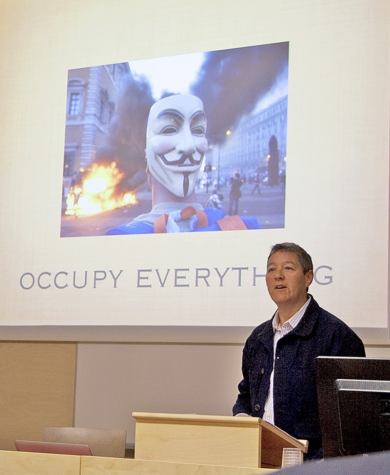 Halberstam käsitteli luennossaan ”No Church in the Wild” 2010-luvun poliittisia mellakoita Kanye Westin ja Jay-Z:n samannimisen hip hop -hitin kautta. Laulussa käsitellään 2010-luvun poliittista turhautumista ja siitä syntynyttä anarkismia: