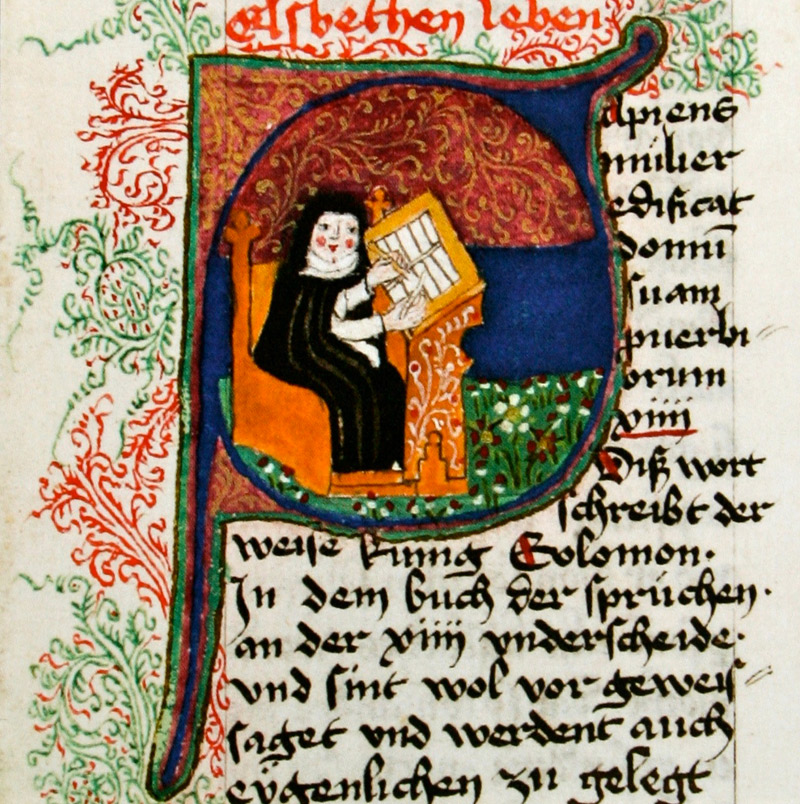 Pyhän Katariinan dominikaaniluostari Nürnbergissä oli 1400-luvulla merkittävä kirjallinen keskus, jonka kirjastosta on säilynyt satoja keskiaikaisia käsikirjoituksia. Kuva esittää dominikaaninunna Elisabeth Stagelia kirjoittamassa Tössin luostarin sisarkirjaa ja se sisältyy käsikirjoitukseen, joka on kopioitu pyhän Katharinan luostarissa n. 1454 (Stadtbibliothek Nürnberg, MS Cant. V 10a, fol. 3r). Elisabeth Stagel on tunnettu paitsi sisarkirjan kirjoittajana myös dominikaaniveli Heinrich Seusen hengellisenä tyttärenä.