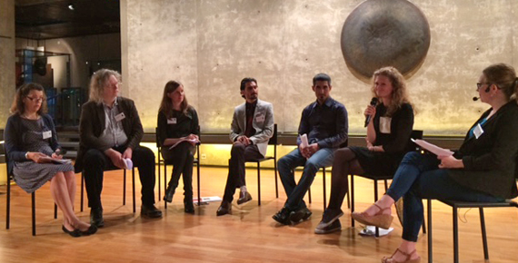 Bahaulddin Rawi kertoo. Taustalla Laura Sillanpää, Akhlad Al-Mudhafar ja Sonja Valtonen viulunsa kera. Aboagora 17.6.2016, Sibelius-museo. Kuva: Maarit Leskelä-Kärki ja Kimi Kärki.