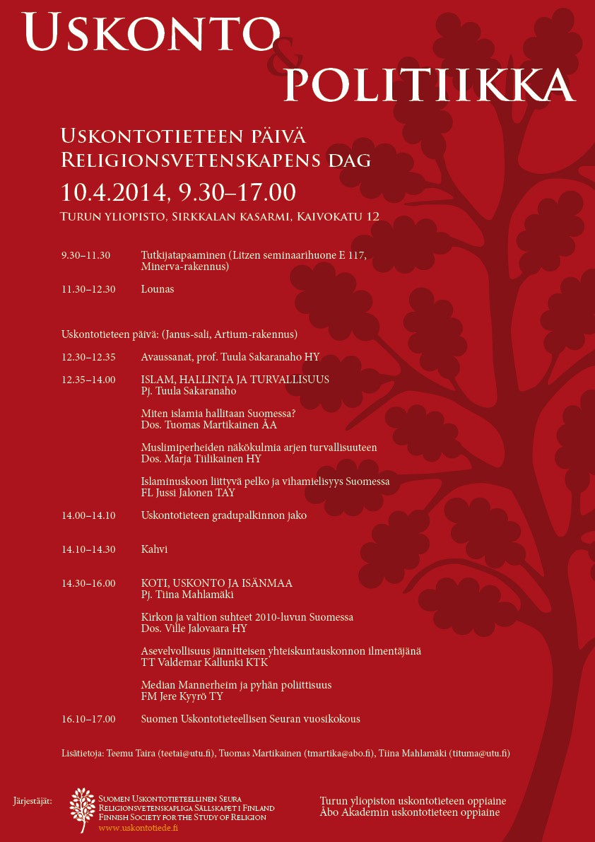 Vuoden 2014 uskontotieteen päivän teemana on uskonto ja politiikka. Kaikille avoin seminaari järjestetään Sirkkalan kampusalueen Janus-salissa torstai-iltapäivällä 10. huhtikuuta. Aamupäivällä pidetään uskonnosta ja politiikasta kiinnostuneiden tutkijoiden tapaaminen, jonne kaikki aihepiiristä innostuneet ovat tervetulleita. Tapaamisen tavoitteena on tutustua eri oppiaineiden tutkijoihin ja esitellä ajankohtaisia tutkimushankkeita ja julkaisuja.