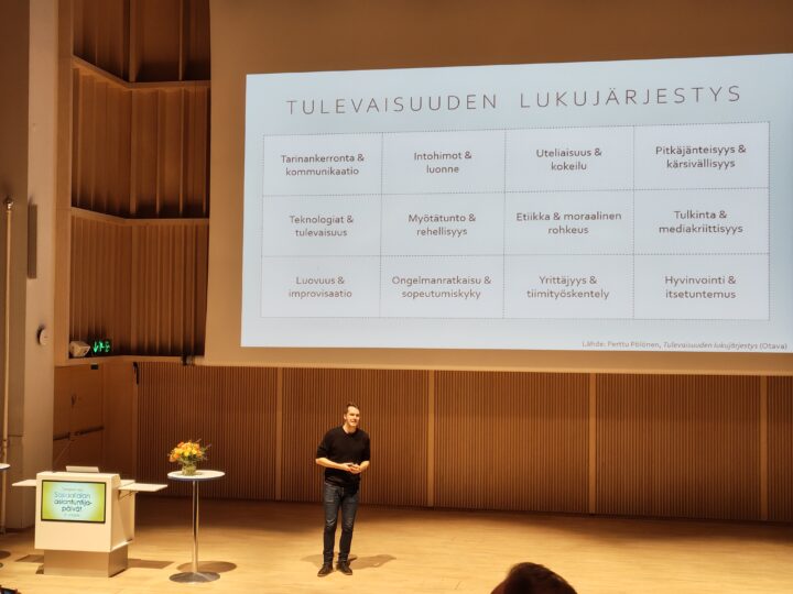 Kuvituskuva: Futuristi Perttu Pölönen luennoi Tampereella 3.3.2026 vuorovaikutteisesti ’tulevaisuuden lukujärjestyksen’ elämänalueista, joilla teköäly ei tule näillä näkymin korvaamaan inhimillistä kohtaamista. (Kuva: Ville Päivänsalo)