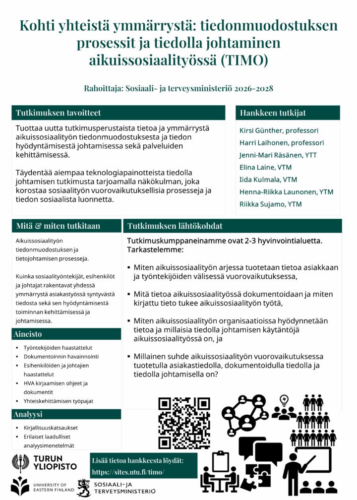 Julkaisut ja esitelmätJulkaisutStay tuned!EsitelmätPosteri, Sosiaalityön tutkimuksen päivät 12.-13.2.26 (Kuopio)Työryhmä esitys (diat tulossa!), Sosiaalityön tutkimuksen päivät 12.2.26 (Kuopio)