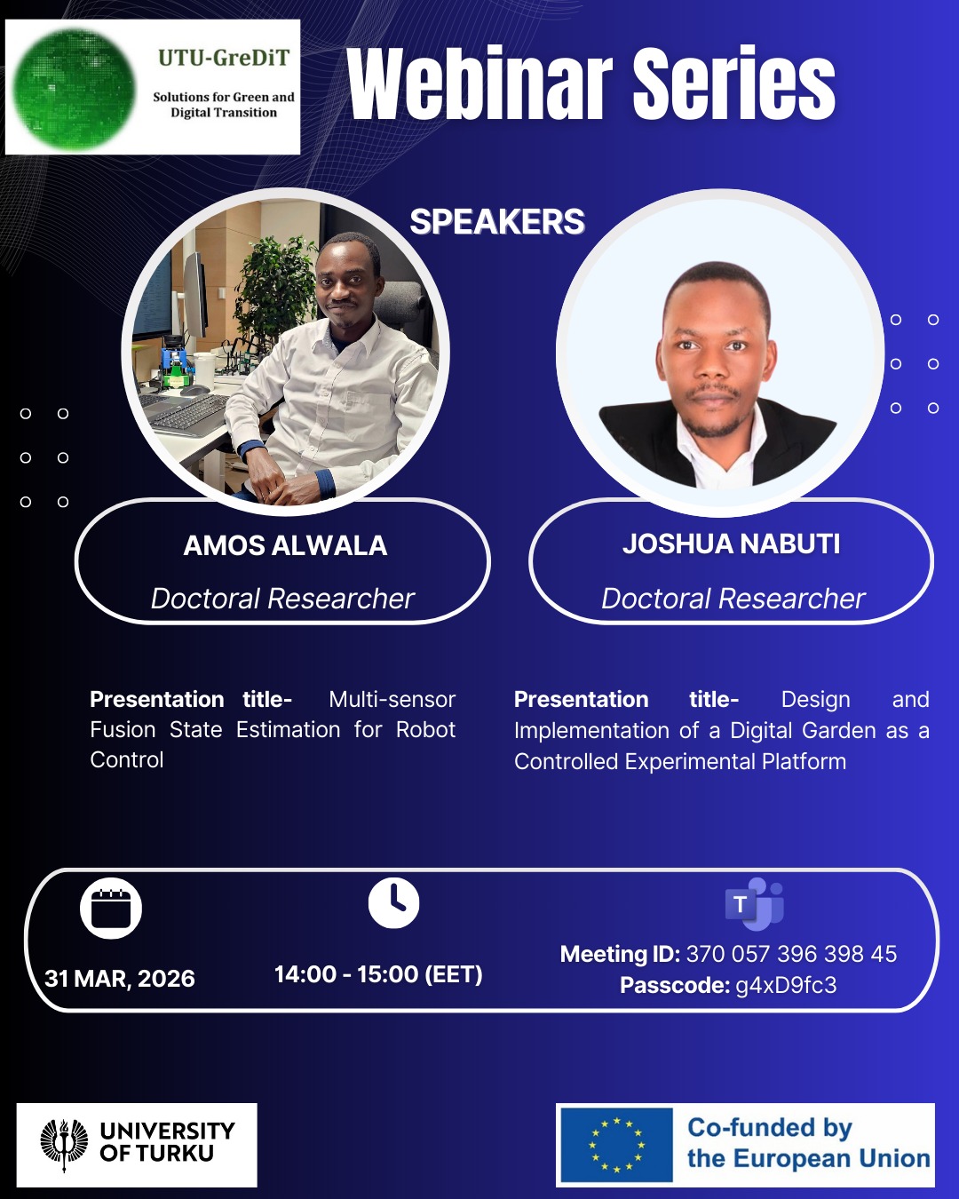Join us for the March UTU-GreDiT webinar where we get to hear about the research of two UTU-GreDiT fellows Amos Alwala and Joshua Nabuti. The webinar is held on 31 March 2026 at 14:00-15:00 (local time in Finland)! You can join the webinar using this link.