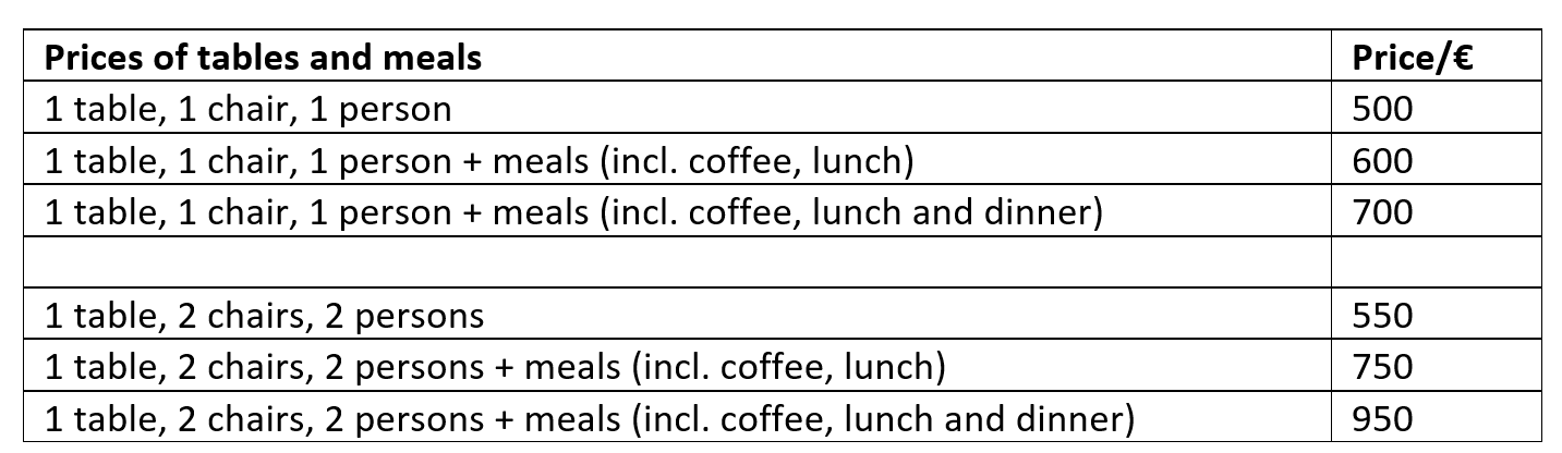 The price list for exhibition tables and participation can be found on the table below.